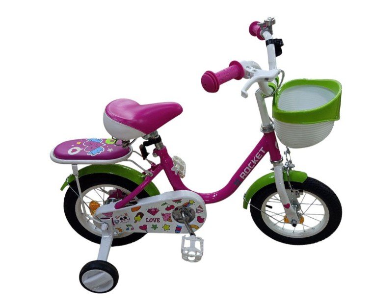 Детский велосипед Rocket стальная рама, алюминиевые обода, размер колеса 12 дюймов, задний ножной тормоз, дополнительные колеса с усиленным кронштейном, кожух цепи защищает ноги и одежду ребенка, светоотражатели, звонок, багажник. Для детей от 2 до 4 лет (до 98 см).