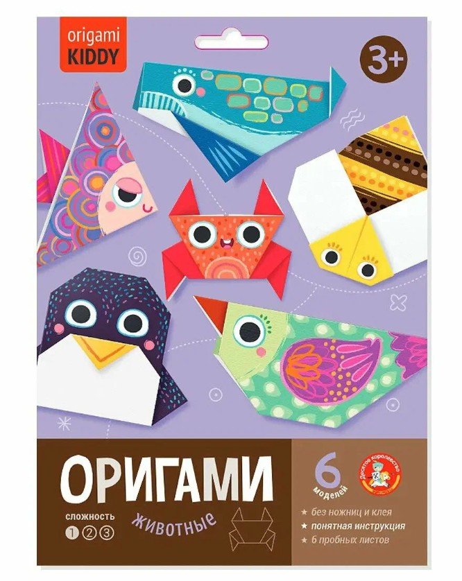 листы цветной бумаги — 6 шт. (14 х 14 см), черно-белые тренировочные листы — 6 шт, инструкция по складыванию