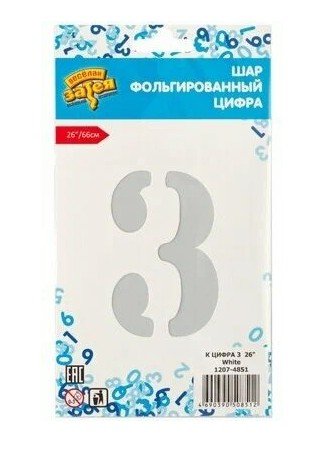 Шар фольгированный "Цифра 3" 26/66см Белый 1207-4851